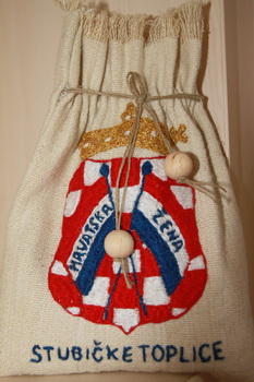 Ovaj dojmljiv uradak izrađuje se od domaćeg platna na kojem se ocrtava grb Općine, grb Udruge ili kreiraju raznoliki cvjetni motivi koje potom vješte ruke članica izvezuju u raznim bojama. Toplička žačk